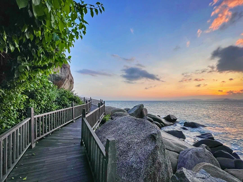 日落时分,石梅湾的魅力被推向高潮。金色的阳光洒满整片海湾,浪花在夕阳的映衬下闪烁着光芒。这里没有刻意的浪漫,只有大自然的真实馈赠。此刻,无论是独自感受,还是与爱人牵手漫步,都让人沉醉其中。