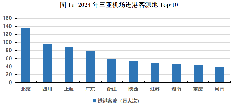 1.境内客源地集中于经济发达地区。三亚境内客源主要来自北上广、江浙及川渝地区,2024年三亚机场进港前十大客源地依次为北京、四川、上海、广东、浙江、陕西、江苏、湖南、重庆、河南,占总体进港客流67.0%。其中河南地区进港客流同比增长5.0%;中短途客源地的广东地区进港客流同比增长1.9%。