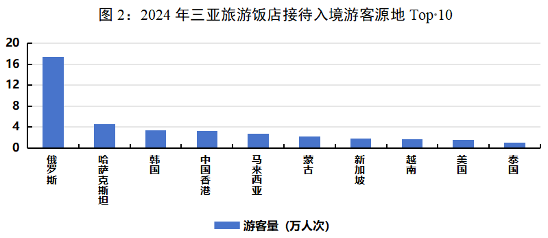 2.境外俄语市场和亚洲市场增长显著。三亚累计开通境外航线29条,覆盖13个国家及地区,包含8个海南59国免签国,触达中国香港、首尔、河内、阿拉木图、莫斯科、伦敦、大阪及塔什干等21个境外航点。在境外航线开通数量较2019年恢复率为53%的情况下,入境游客数量和消费分别达到2019年约80%和近70%水平。三亚旅游饭店接待入境游客前五大客源地依次为俄罗斯、哈萨克斯坦、韩国、中国香港、马来西亚。传统市场稳步升温,俄罗斯、蒙古和哈萨克斯坦的同比增长分别达到11倍、5倍和3倍;新兴市场增幅显著,越南、泰国和新加坡游客量已分别超过2019年水平的998%、66%和9%。