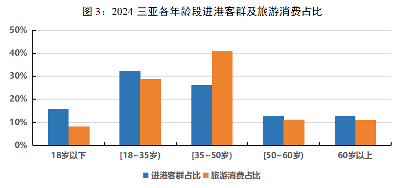 3. 青年及亲子家庭客群为出游主力。2024年三亚机场进港35岁以下年龄段占比近半,其中18至35岁占比32.4%,位列各年龄段首位。结合OTA消费数据来看,18至50岁年龄段为旅游消费主力群体,占比达69.7%,其中35至50岁年龄段覆盖大部分亲子家庭客群,占整体进港客流26.3%,旅游消费占比达40.2%。此外,随着银发群体规模逐渐扩大,60岁以上的老年客群旅游消费占比10.9%,同比提高1.1个百分点。