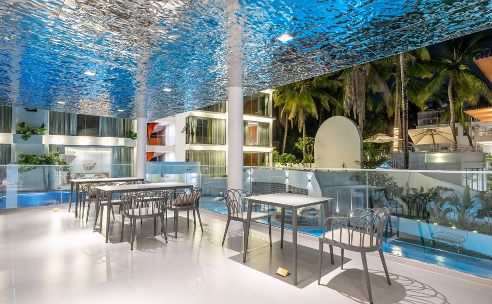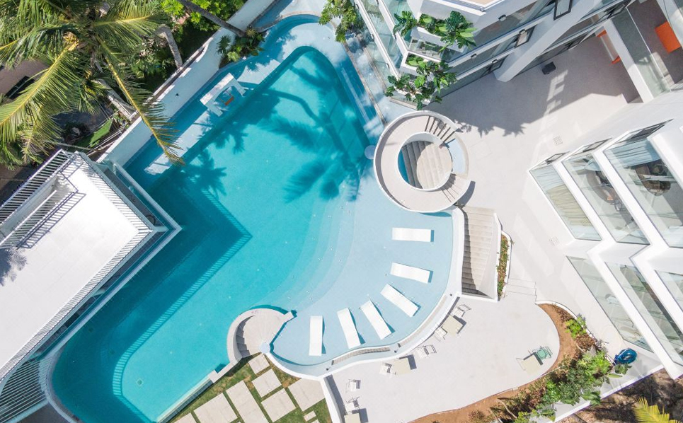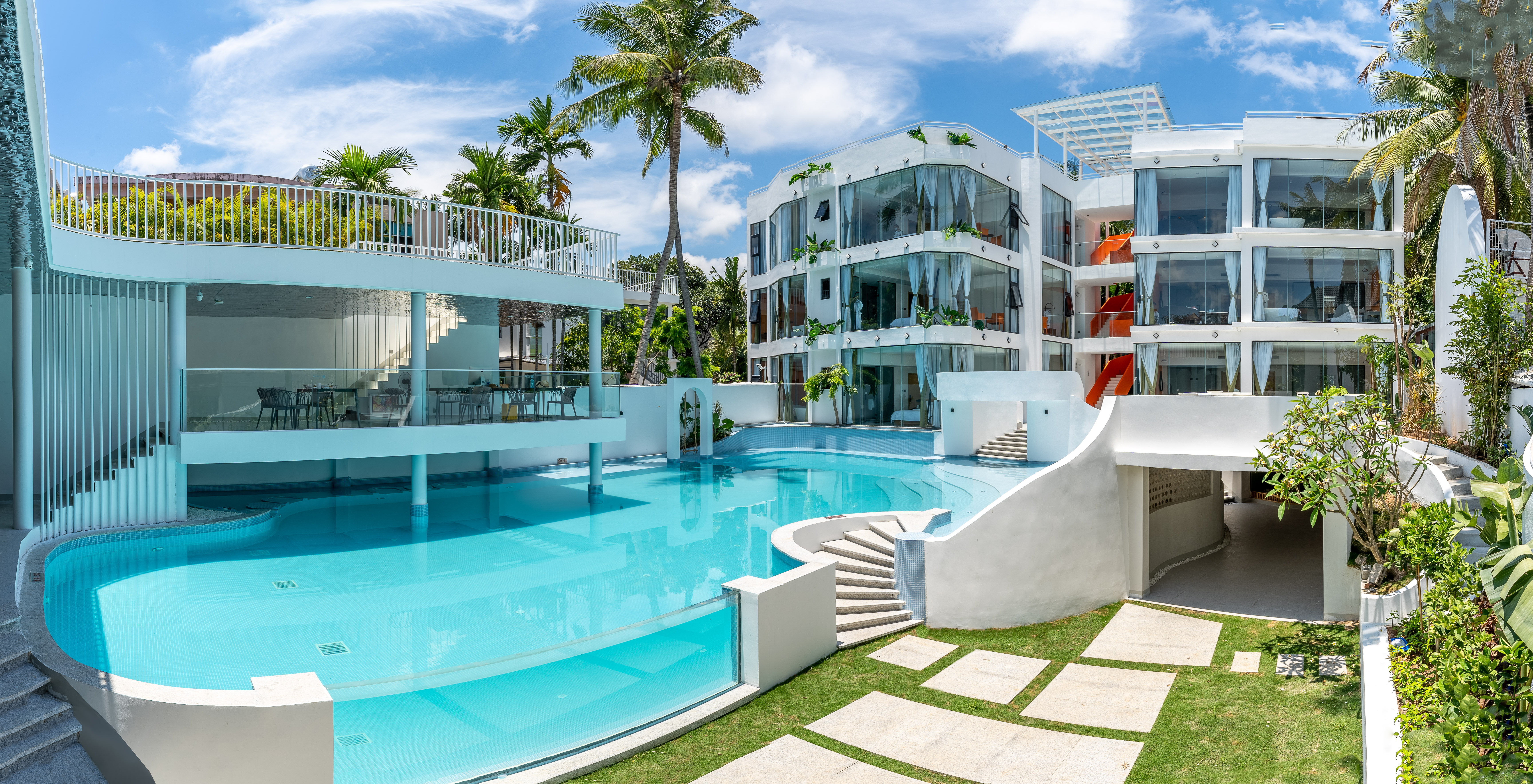 民宿主体由两栋白楼组成,连接白楼的是象征着通往希望的暖橘色螺旋楼梯,爱马仕配色的旋转楼梯,线条凌冽的区域划分,院子前天蓝的ins风大泳池与院子中白色涂装相映生辉,入眼仿佛置身天堂,后院椰林小道宛如隐居于世,为这惬意的环境点缀了民宿独有的神秘,随手一拍皆是美景。