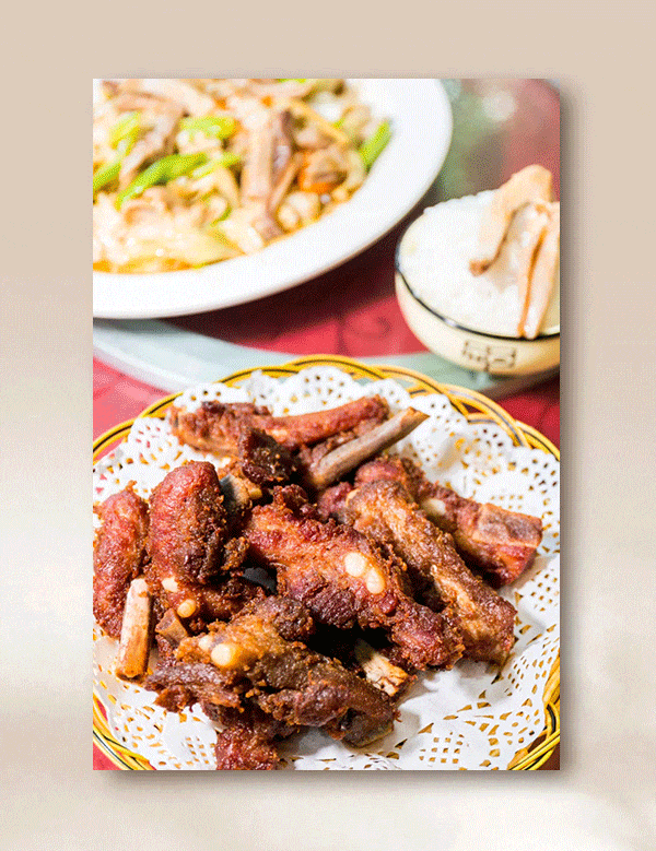 При упоминании свиных ребрышек Фуцзяцяо, как блюда, на котором вырос каждый житель Фуцзяцяо, первая реакция всегда направлена на семейный отель Zhu в городе Фуцзяцяо (где и зародились свиные ребрышки Фуцзяцяо). Жена владельца отеля рассказывает, что это блюдо готовится из свежих ребрышек местных черных свиней, которые маринуются и обволакиваются в специальном кляре, а затем обжариваются во фритюре до золотистой корочки, с хрустящей внешней стороной и нежной внутренней, что незабываемо для каждого, кто когда-либо ел это блюдо!
