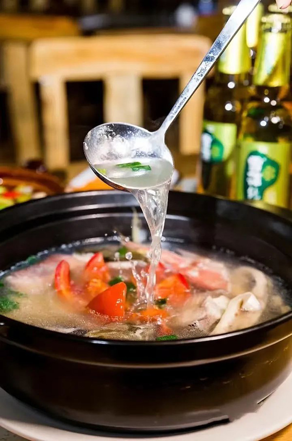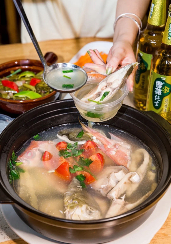 Миска воды, несколько ломтиков имбиря, а затем положить Санья местного производства натуральные маринованные бобы, маринованные персики и другие ингредиенты медленно кипятить в течение нескольких мгновений, миска оригинальный аромат рыбы суп на хороший, «свежий прямой прыжок бровь». Если вы хотите ощутить свежайший вкус моря, этот суп - то, что вам нужно.