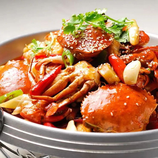 "Цветочный краб, обжаренный с луком и имбирем" - одно из десяти самых известных блюд в Санья.В процессе приготовления крабовое мясо пропитывается ароматом имбиря и зеленого лука. Сладость, аромат и свежесть сочетаются в нем. Аромат зеленого лука раскрывает вкус крабового мяса, смешанный с легкой сладостью, что делает его необычайно вкусным и обязательным к употреблению!
