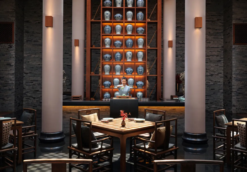 Stepping into Tea House feels like entering a Jiangnan garden. It carries the essence of Huizhou architecture—white walls, black tiles, ceramic roofs, and a soaring nine-meter ceiling—creating a solemn yet graceful Eastern aesthetic. Sunlight filters through the courtyard, casting dappled shadows and infining each meal with ceremony.