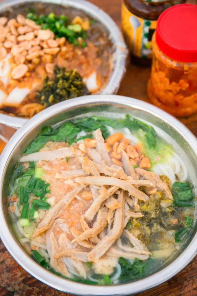 Gangmen Fen features a light broth simmered with sea snails and dried shrimp, embracing delicate rice noodles, handmade fish cakes, and crispy shrimp flakes—each spoonful brimming with maritime freshness. Gangmen Sour Noodles, on the other hand, are made with sweet potato noodles and steamed buns as the base, topped with a special sour sauce, crispy fried bits, and peanuts, offering a cool, smooth, and refreshing comfort on hot summer days.
