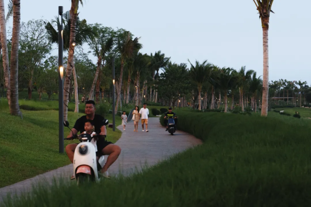 This is not only a haven for sports enthusiasts, featuring a skate park, football field, and riverside cycling path, but also a hidden paradise for photographers seeking a unique ambiance. Strolling beneath the spectacular bougainvillea waterfall, or wandering through the misty rainforest “Jungle Adventure Zone,” the ecological landscape blends perfectly with modern architectural art, making every snapshot a stunning forest scene.