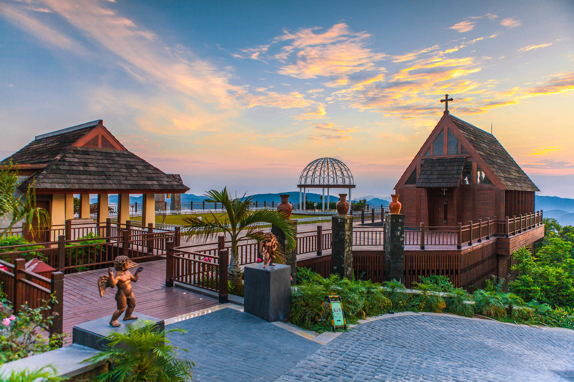 这里是著名电影《非诚勿扰2》的主要取景基地,公园内有著名的横跨两座山的索桥、有伫立在山上的非诚勿扰试婚房、更有独一无二的山顶西式教堂、天池,同时还能远眺亚龙湾全景。