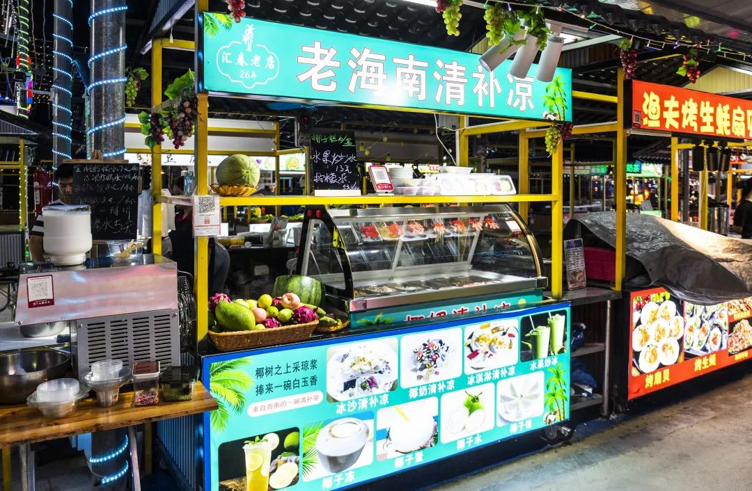 在各大热闹的夜市,「老海南清补凉」的摊位往往成为人们聚集的中心。那一碗碗精心制作清补凉,搭配着独特的椰奶或者糖水,点缀着各种新鲜的水果和美味的干果,不仅美味可口,而且具有清热解毒、润肺止咳等多种功效。