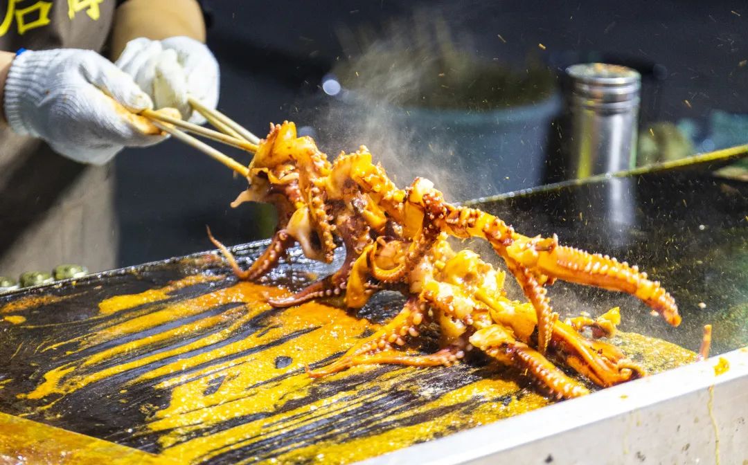 这铁板鱿鱼你确定不来两串吗!!在老板熟练的操作中,一串串鱿鱼呈现出了金灿灿的色泽,香味扑鼻,滋滋冒油;味道新鲜哟,是很焦叽叽的口感,鱿鱼肉扎实得很,没有异味儿哦,全是鱿鱼味儿,香的嘞~小伙伴们一定要来试一试!
