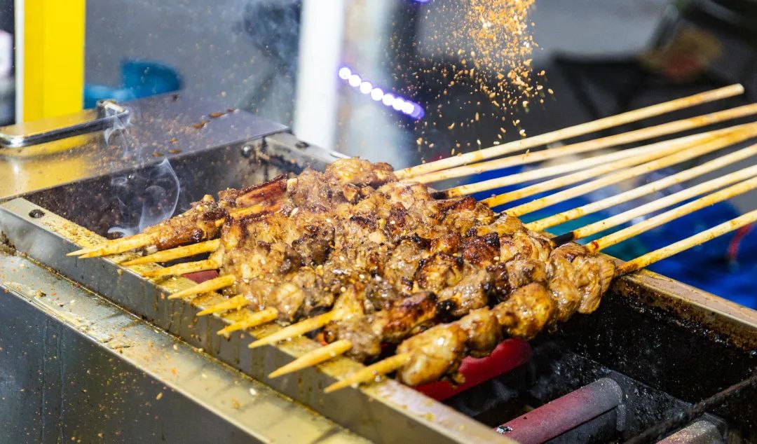 随着时间推移,火候达到了高潮,羊肉的香味便开始随风冲入鼻腔,刺激味蕾,令人垂涎三尺。老板熟练地进行着最后一道程序:撒上辣椒面!看这色泽油亮的肉串,忍不住咬上一口,肉质鲜嫩脆软,味道麻辣醇香,每一口仿佛都是人间极致的享受啊!