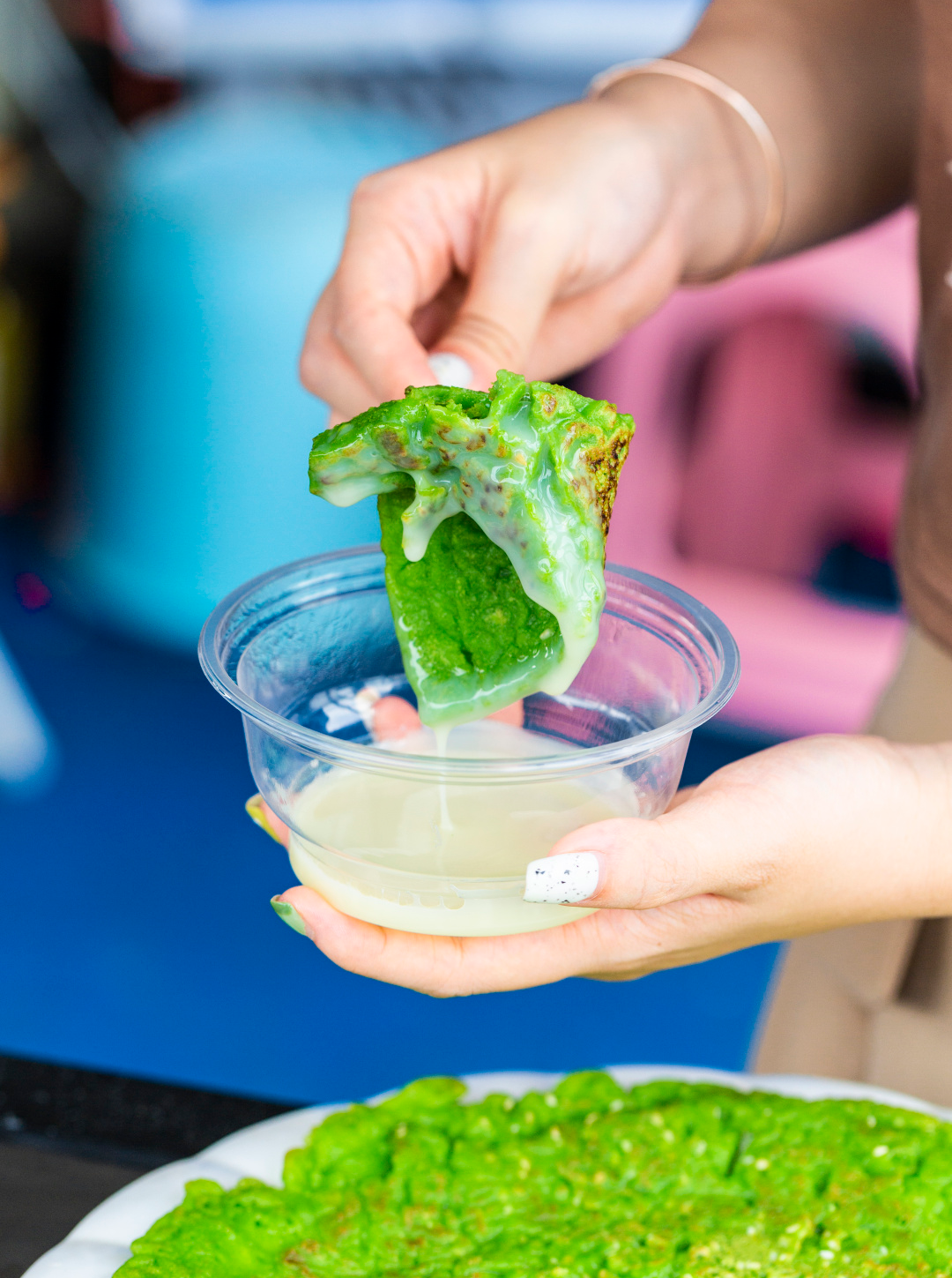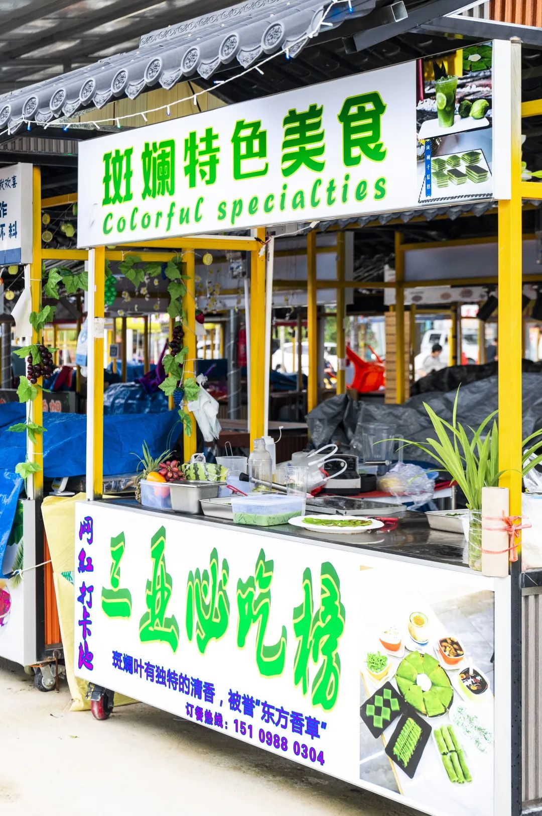 在这里终于可以实现斑斓自由啦!这是一个专门制作斑斓小吃的摊位,老板娘是个“超级斑斓脑袋”。