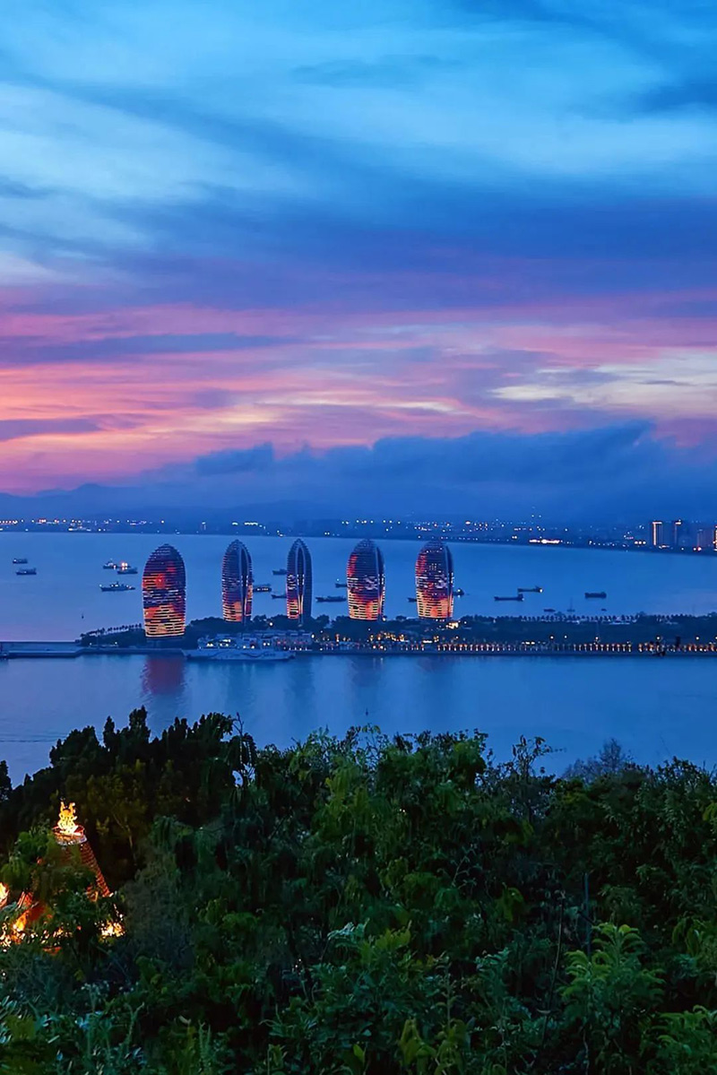 如果想要更全面地感受三亚这座城市夜晚的魅力,还可以坐游船,从不同的角度和方位来欣赏三亚的迷人风光和夜晚的醉心美景。游船缓缓穿梭,会经过鸿州游艇码头、鹿回头风景区和三亚湾。无边无际的海在夜幕的衬托下,显得越发广阔深邃,两岸灯火相互交融,水天一色,如诗如画。满满的治愈感伴着阵阵海风扑面而来,此刻只需细细感受三亚别样的浪漫。