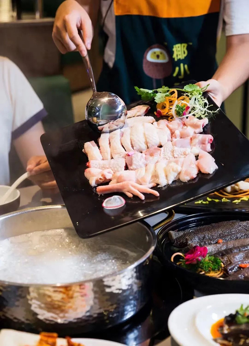 椰子鸡作为养生滋补的美味,食材至关重要。鸡肉选自散养的走地鸡,肉质紧实而不柴,青椰和矿泉水以3:1的比例混合,每一锅现点现开现倒,保证极高的新鲜度。天然醇香的椰子和新鲜肥美的鸡肉都浓缩在椰子鸡汤里,汤汁鲜香,鸡肉嫩滑,让人欲罢不能。
