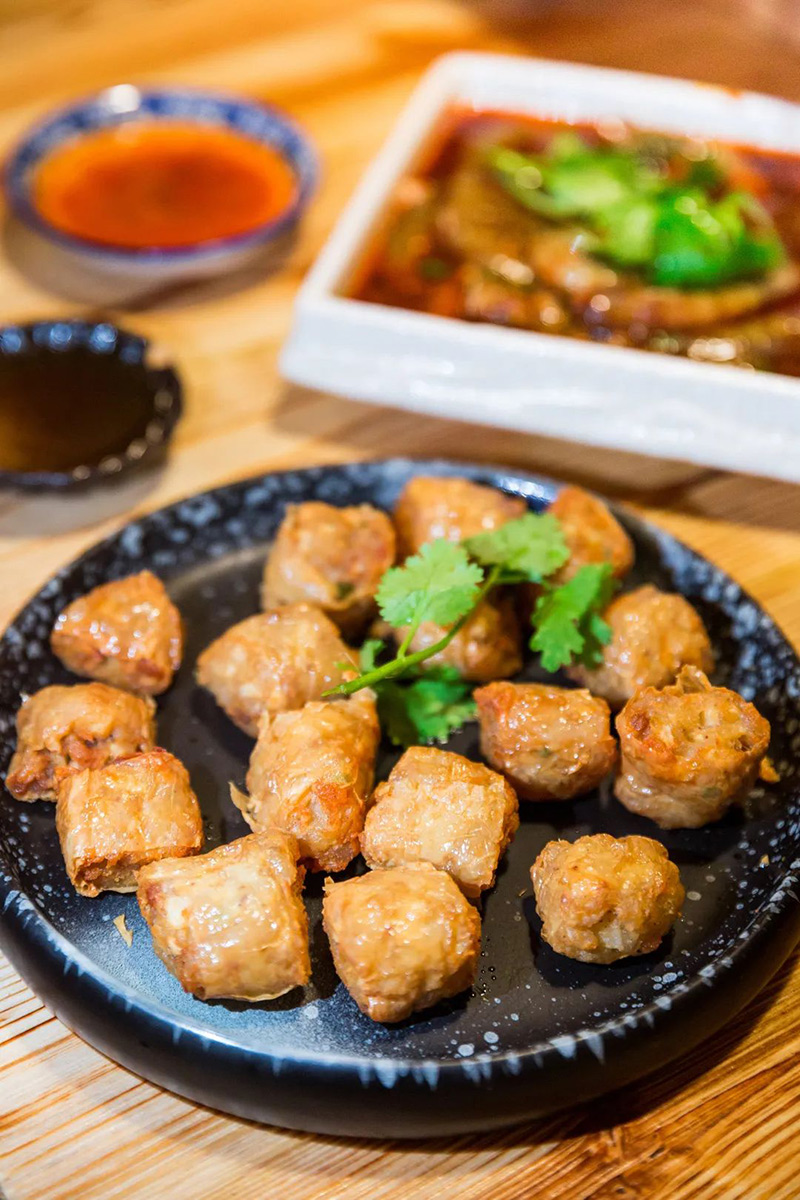 潮汕的炸粿肉也堪称一绝,刚出锅的炸粿肉更是金黄飘香,让人口水分泌。薄薄的腐皮包裹着五花肉、马蹄、鸡蛋等馅料,蒸熟后放凉,再下锅炸至金黄。咬上一口,酥香无比,细嚼还有马蹄的清香爽脆,肉感十足又口感丰富,着实美味。蘸上甜甜的酱汁后又是另外一种爽口滋味,一口一个,根本停不下来。