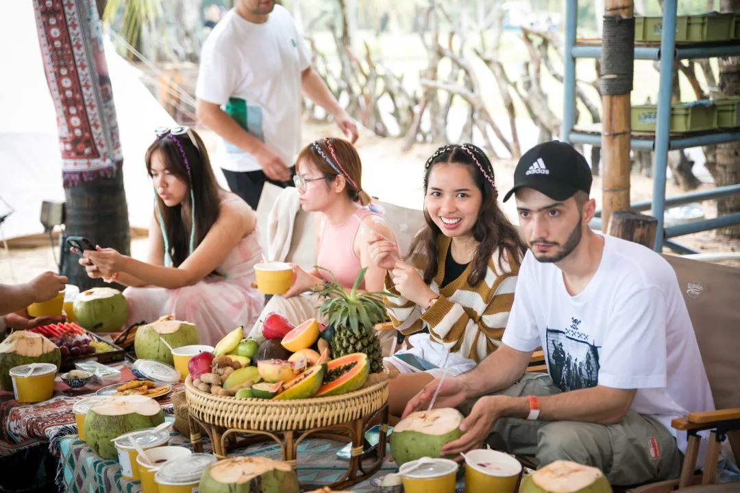 在三亚,不能错过的是在海边露营。在海浪的韵律中,在遮阳的天幕之下,国际青年享受悠哉游哉的下午茶时光,精致甜点、三亚特色水果、椰子、清补凉……氛围感十足。
