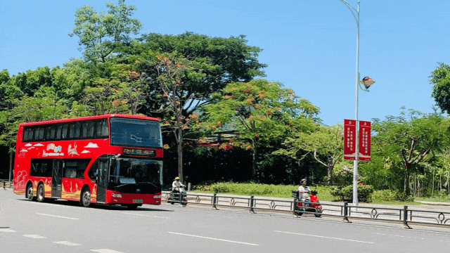 观光巴士犹如一座能移动的风景台,在不断倒退的街景中让你看尽三亚山海河城的每一瞬。