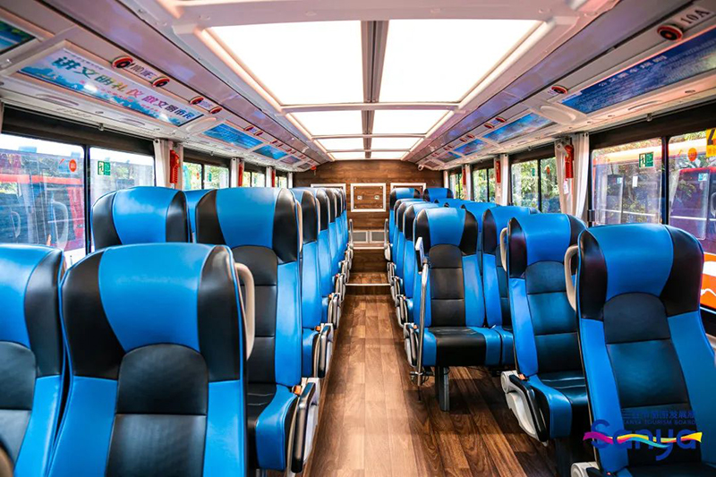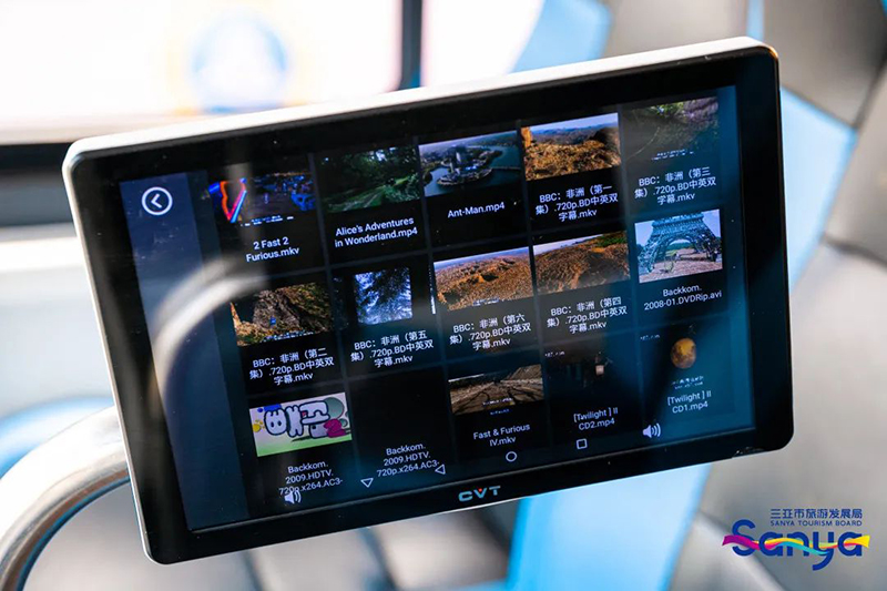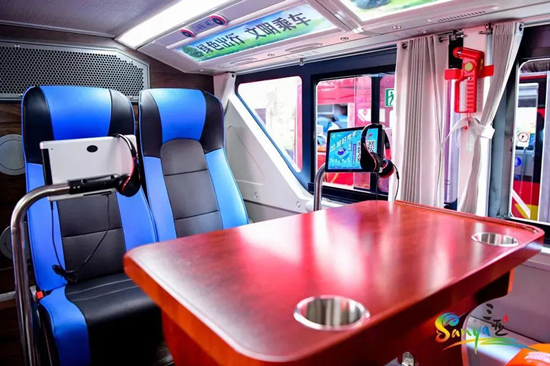 最最特别的是,每个座椅后方都配置了一台支持游客自行操作的平板电脑,且配置了耳机与平板电脑相连,宝宝们可以通过平板电脑购买景点门票、了解旅游资讯,介绍语言有中、俄、英三语,外国游客也可无障碍使用哦~