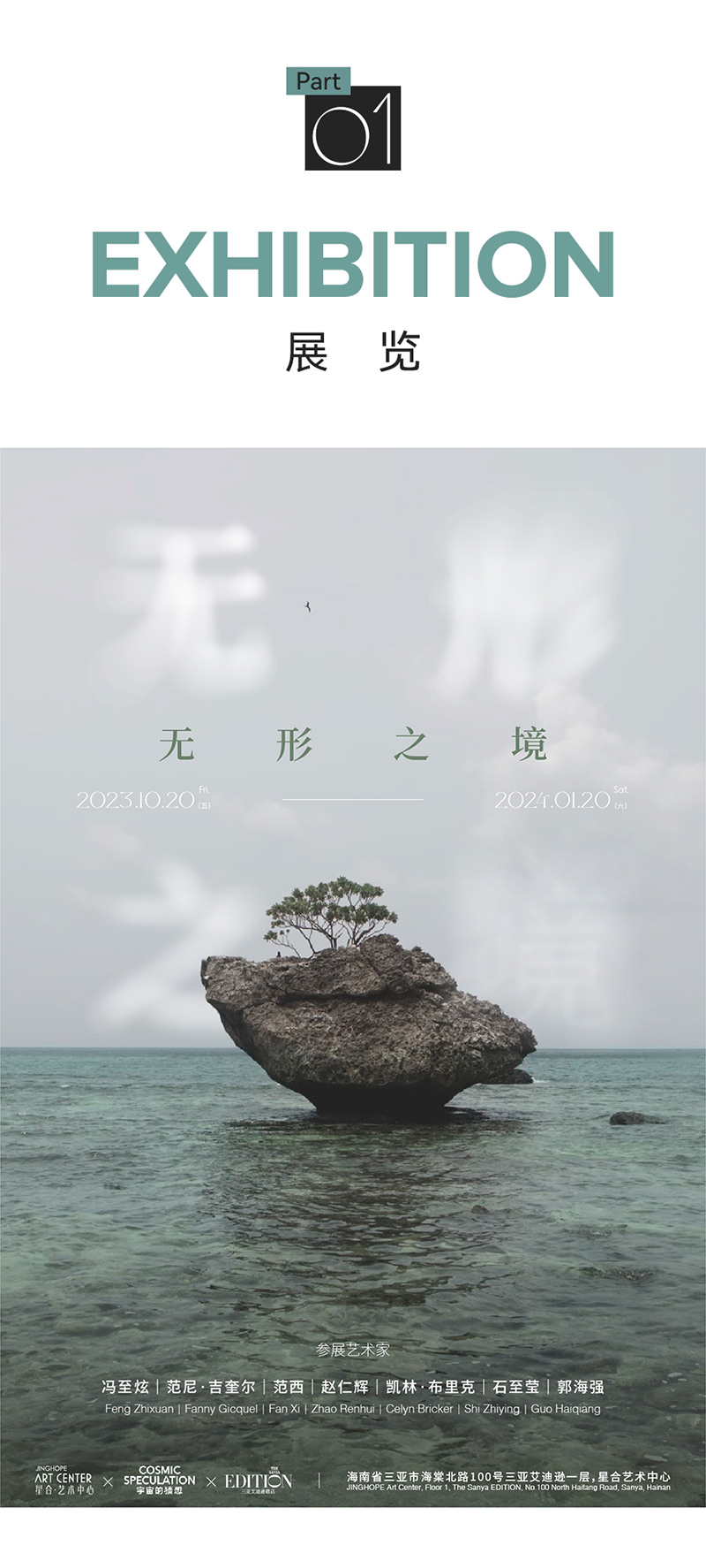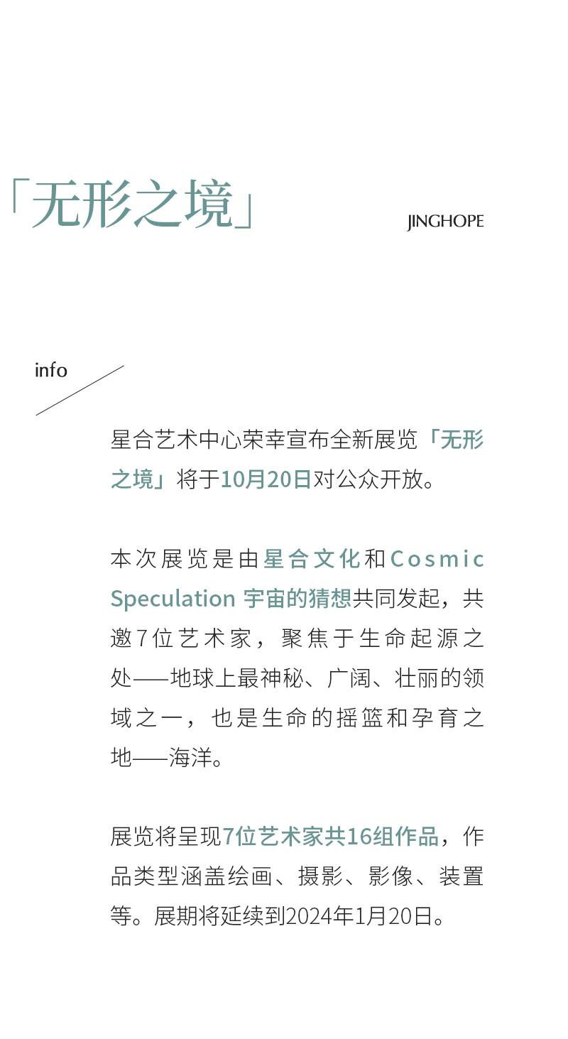 此次展览在艺术的范畴内对于“无形之境”从内至外进行体现的同时,更是着眼于“海洋”这单一生态体:凯林布里克、冯至炫分别以互动装置与立体造型来呈现对“社会”与“海洋”关系的辩证性思考;范西的影像与装置也在“海岛”的语境下进行个人经验的传达;同时,范尼吉奎尔与石至莹通过装置和绘画体现出“天人合一”的理念;郭海强、赵仁辉则从更为客观的视角通过绘画与影像对于自然观察的显形。