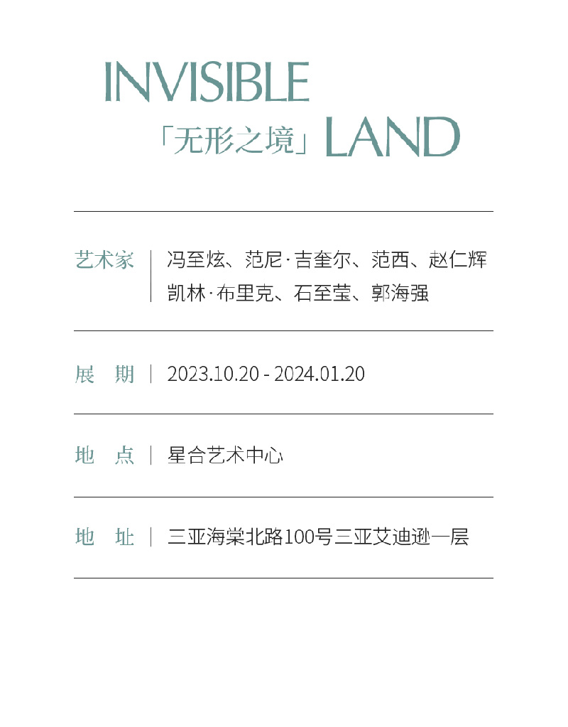 作为社会文化的生产物,艺术不仅是反映客观事物的载体,更结合着个人体验与当下社会环境中的思想。本次展览《Invisible Land 无形之境》呈现在当代艺术板块中对于上述关系的观察:我们不可否认自然资源的重要性与其产生效益的必然性,同时相对应的自然也在其中进行自我消化与适应。而在一切思考的客观前提是,自然不可被征服——它无形而庞大,掌握着一切事物存在的规律并在其内部发生的调整都不断被融合吸收,形成新的规律并产生的结果是不可逆的。