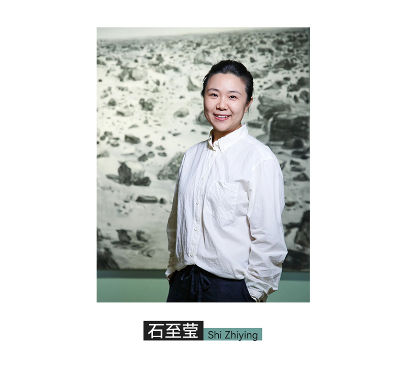 石至莹以她近似单色笔触的广延的场景,比如海、沙、草等为人熟知。她试图用绘画语言表现事物的存在状态。在石至莹的绘画实践中, “显现”与“消隐”的互相转化被特别强调: 水体、岩石、容器、佛像、珠子的质感和体量通过绘画性的笔触呈现, 物体的形状却并不坚实, 而是经由独自成立的线条、笔触和颜料传达内在的呼吸与节奏逻辑,在与视觉经验的相互作用中建立起感性又稳定的结构。