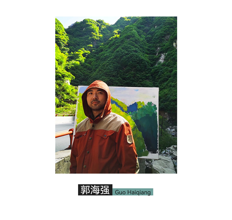 1980年生于陕西,2005 年毕业于西安美术学院雕塑系,目前主要从事架上绘画创作。他的艺术实践沿着雕塑语言与绘画语言的边界进行探究,旨在通过绘画的方式为自己的精神世界塑形。近年来,郭海强的主要创作方式乃是“写生”。他骑行至终南山,独自通入山中,以油画勾勒山景的形态,并据此完成画作。