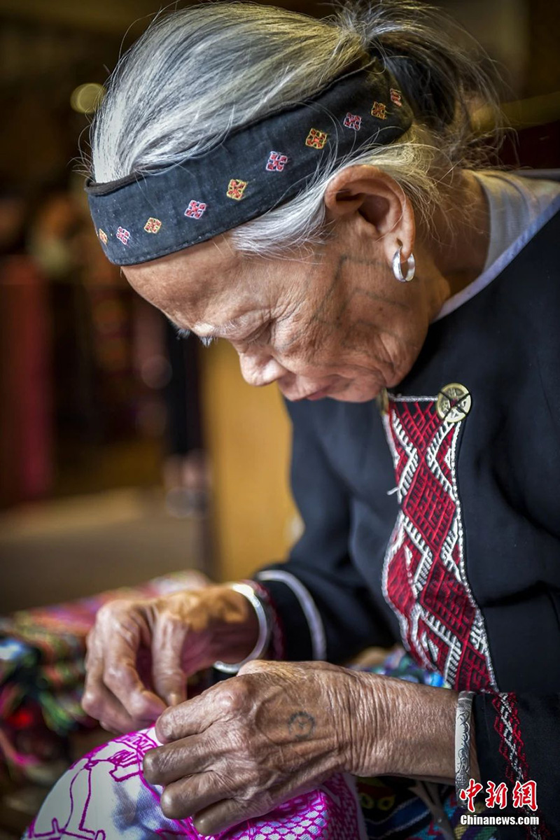 一位面部有文身的黎族阿婆正在绣黎锦。骆云飞摄
