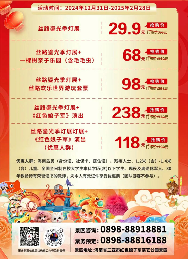 1月29日-2月4日期间(初一至初七),亚龙湾热带天堂森林公园推出“新年嗨森游园家庭套票(2大1小)”包含门票+游览车+索桥+玻璃栈桥+雨林魔幻影院”,仅需698元(原价954元),优惠套票携程、美团、抖音平台线上销售,不可与其他优惠叠加使用。