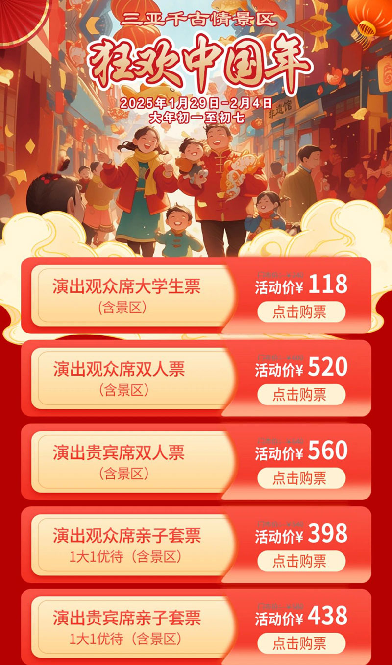 1月29日-2月4日期间(初一至初七),亚龙湾热带天堂森林公园推出“新年嗨森游园家庭套票(4大1小)”包含门票+游览车+索桥+玻璃栈桥+雨林魔幻影院”,仅需1138元(原价1626元),优惠套票携程、美团、抖音平台线上销售,不可与其他优惠叠加使用。