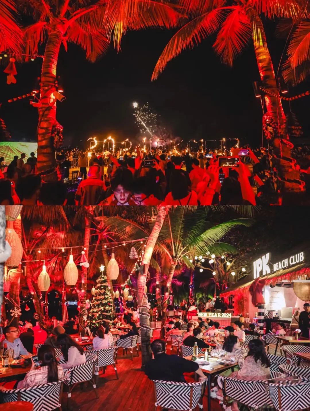IPK沙滩餐酒吧氛围很好,先透露一些好玩的,回顾2024,IPK准备了好多有趣的活动:圣诞装饰、女团舞蹈、泳池泡泡派对、火舞演出、沙滩DJ、烟花互动、以及很有仪式感的跨年点火,大家一起倒数跨新年。