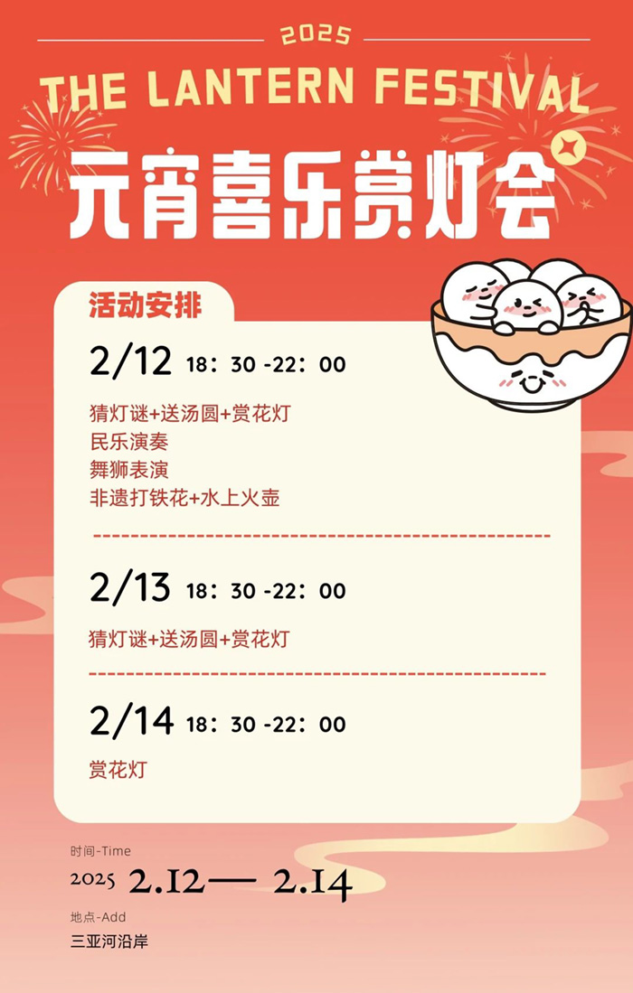 当春节的热闹渐渐远去,我们迎来了又一个充满诗意与温情的节日——元宵节。说起元宵节,你会想到什么呢?是那软糯香甜的汤圆,还是璀璨夺目的花灯?亦或是充满智慧与乐趣的猜灯谜?在这个春日的序章里,我们终于有机会再次邂逅美好时光,紧紧拥抱那依依不舍的“年味”。为了让这个元宵节更加难忘,我们精心为你准备了一份元宵喜乐赏灯会的游玩攻略,邀请你一同沉浸在这浓厚的节日氛围中,感受别样的欢乐与温馨。活动时间是2月12日至2月14日,地点就在美丽的三亚河沿岸。