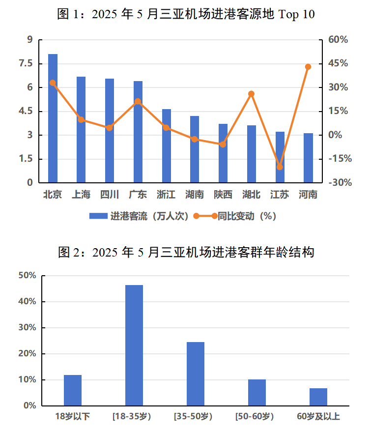 1.青年客群进港占比近半,北京进港同比增幅扩大。三亚机场5月日均进港客流2.51万人次,同比增长11.1%。北京、上海、四川、广东、浙江位列进港客源地前五,其中北京进港客流同比增长32.9%,增幅较4月扩大25.5个百分点;受南方强降雨天气影响,上海、广东等南方客源地进港客流的同比增幅较4月收窄13.5、10.2个百分点,同比分别增长9.6%、21.2%。从年龄结构来看,青年客群的出游占比进一步提升,三亚年轻活力的目的地形象凸显。18至35岁年龄段客群占机场进港总体的46.4%,同环比分别提高2.1、5.2个百分点。来自北京的青年客群规模同比增长40.6%,带动当地整体客流显著增长;四川的青年客群进港占比达52.6%,位列主要客源地首位。