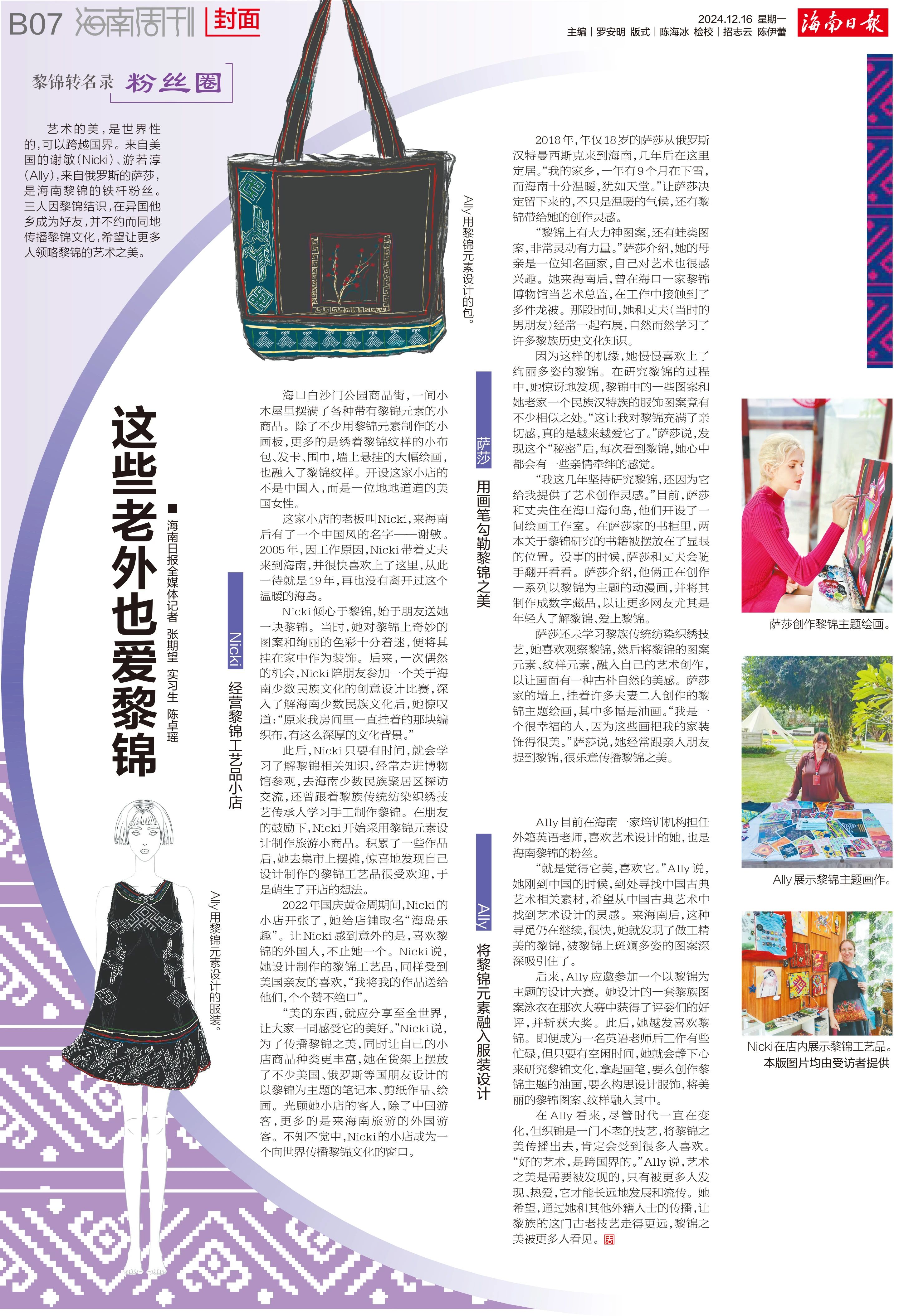 The beauty of art is worldwide and can cross borders. Xie Min (Nicki) and You Ruochun (Ally) from the United States, and Sasha from Russia, are diehard fans of Hainan's brocade. The three of them met because of the brocade, became good friends in a foreign country, and coincidentally spread the culture of brocade, hoping to let more people appreciate the beauty of the art of brocade.