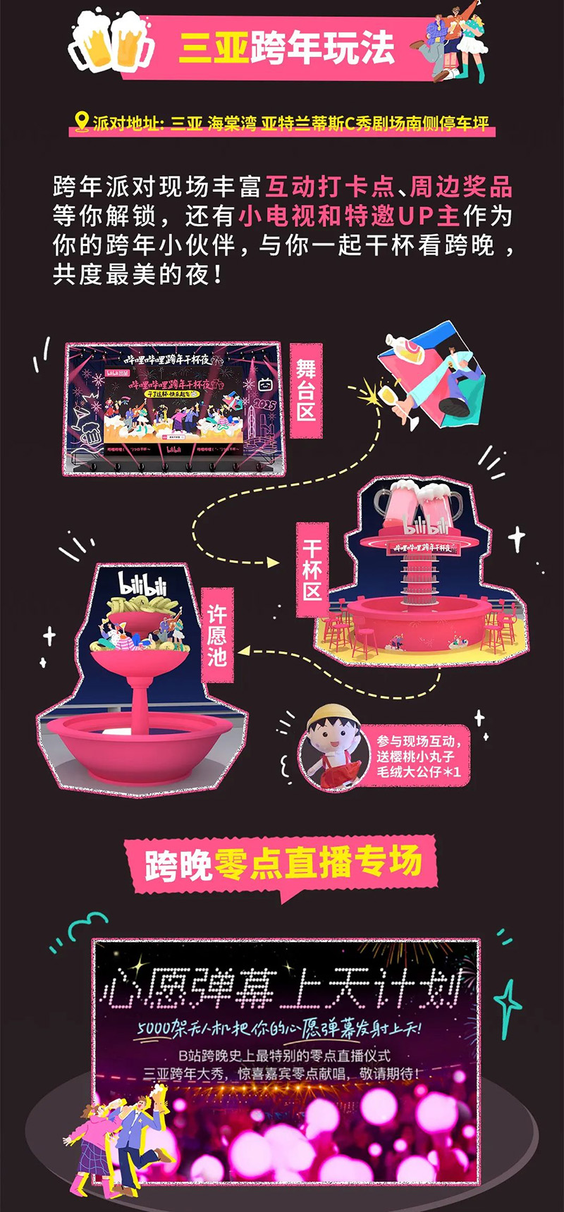 On December 31st at 18:00, Bilibili will host a street New Year's Eve party with ten thousand people at Atlantis. At that time, there will be surprise guests bringing live performances, and they will toast the New Year with the Sanya audience, witnessing 5000 drones lighting up the night sky and completing the "New Year's Wishes on the Sky" ceremony at midnight. There will also be a special Sanya event for "Bilibili New Year's Eve Toast Night" with a variety of interesting exhibition area interactions and surprise New Year's Eve peripherals waiting for you to pick up.