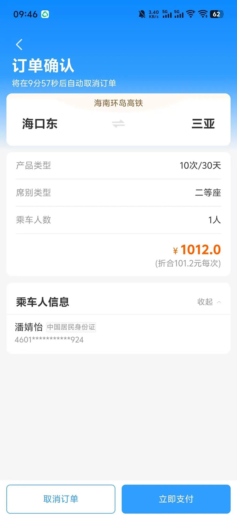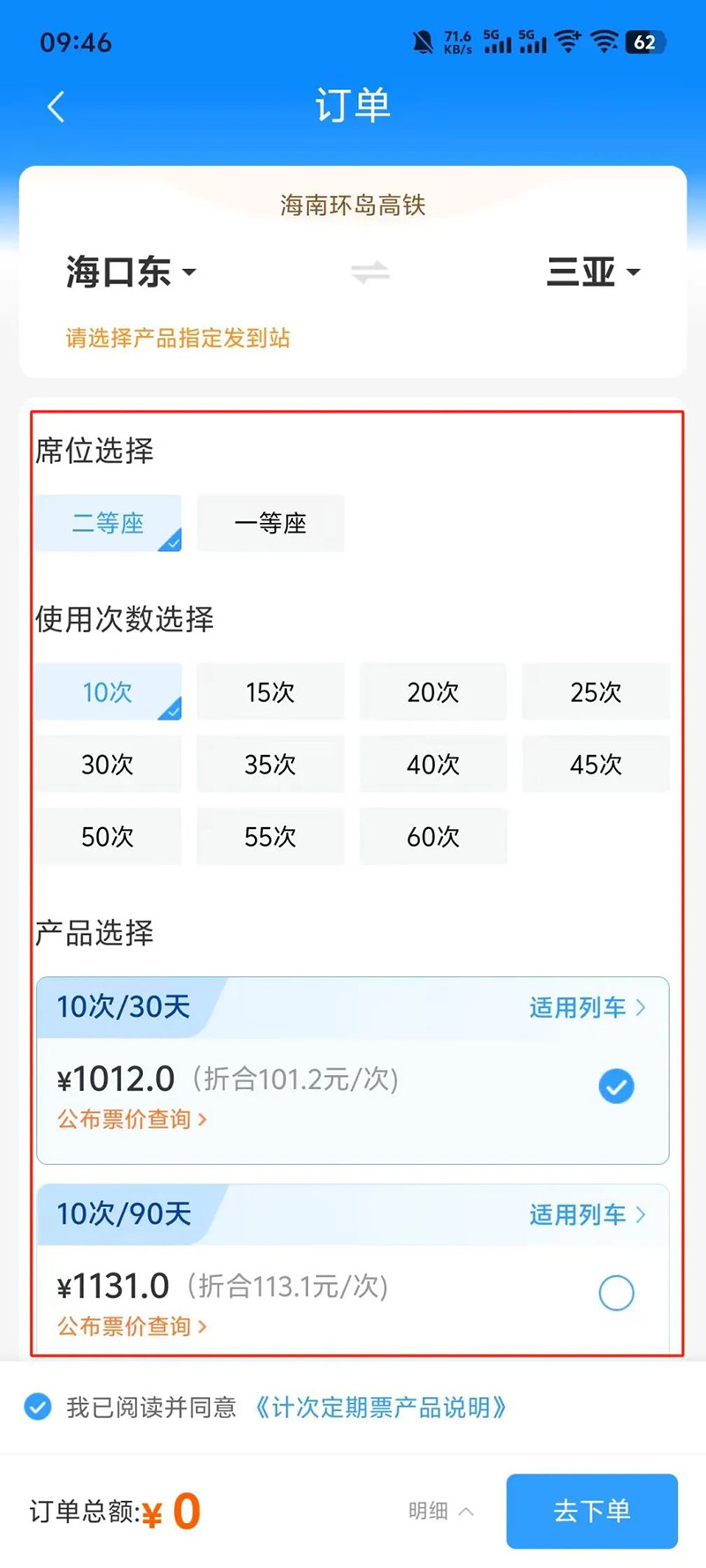Benefits: Taking the second class seat from Sanya Station to Haikou East Railway Station as an example, passengers who buy 30 times/30 days regular tickets can save RMB 892 per month compared to a single ticket purchase; passengers who buy 10 times/30 days regular tickets can save RMB 178 per month compared to a single ticket purchase.
