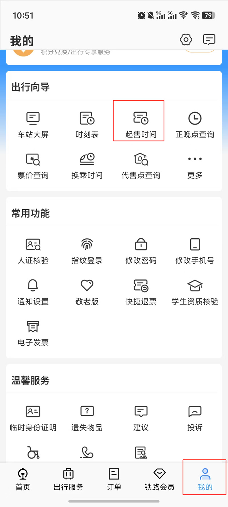 Step 1: Open the railway 12306 APP, click on ‘My’, click on ‘starting time’, you can enter the starting time query page.