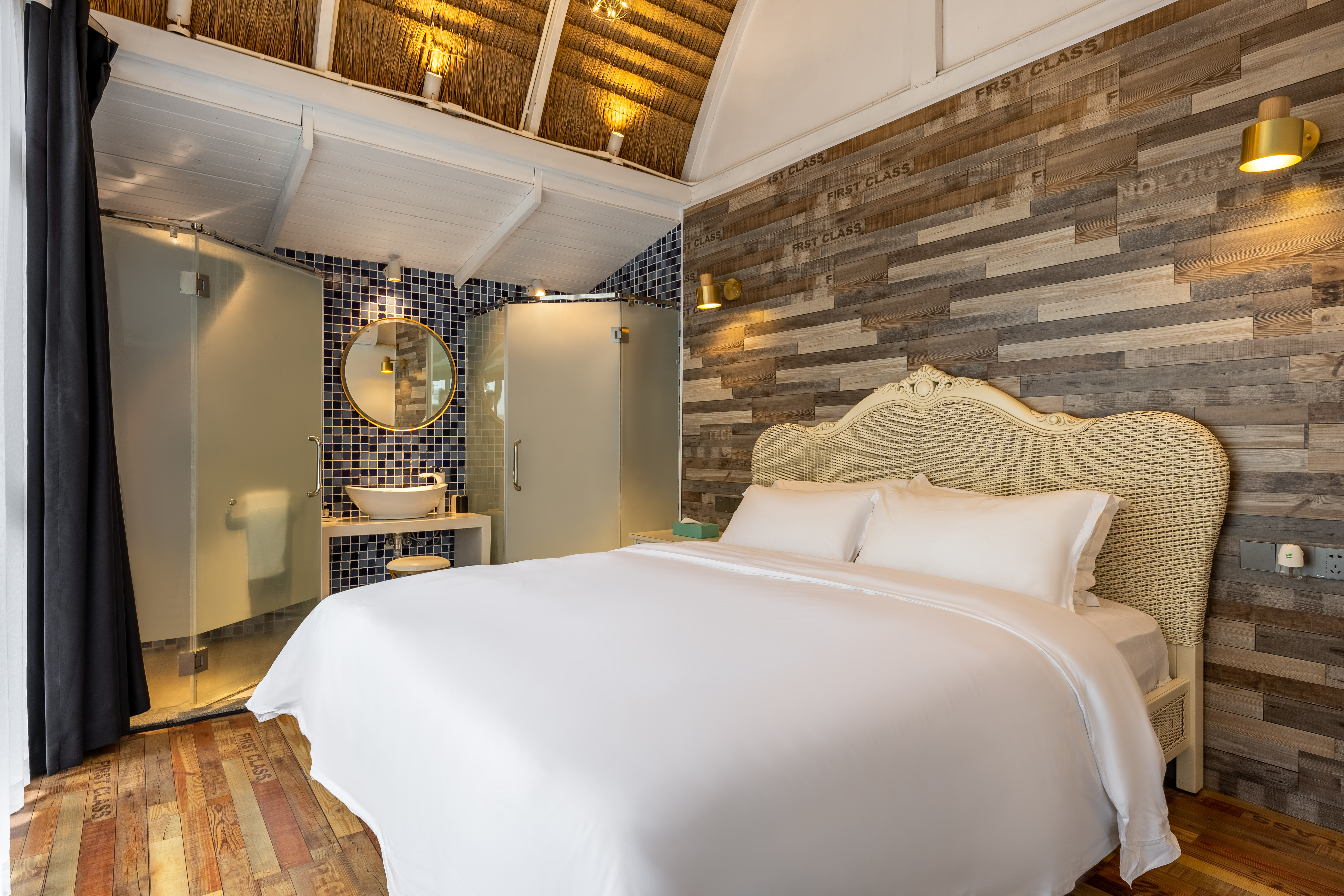 Here, there are courtyards, swimming pools, wooden houses, a restaurant, soaking pools, coconut groves, glass walkways, and many other photography spots. There is also a small beach paradise for children to play...