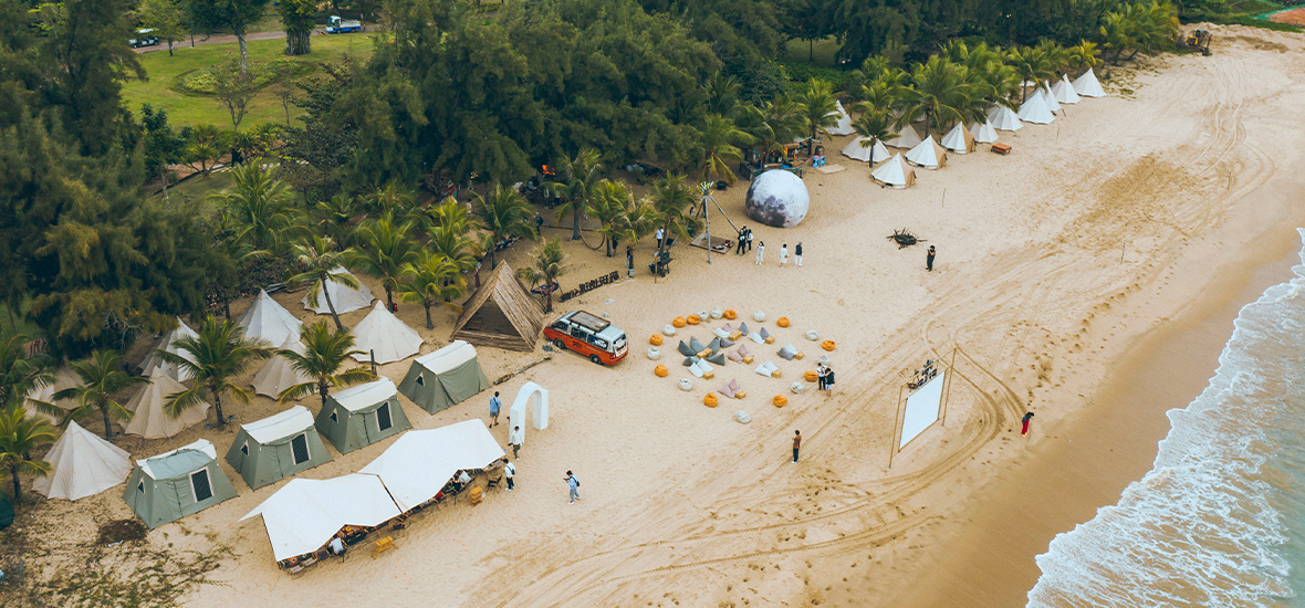 The camp is divided into different outdoor spaces, providing a two-day and one-night glamping tent accommodation experience and more than ten outdoor activities such as music, food, bonfire, culture, party, water sports, etc. In addition, the camp project also has in-depth cooperation with marine sports clubs, outdoor sports clubs, and natural education institutions, and has developed camping products of various styles such as marine, sports, parent-child, etc., to meet different outdoor needs.