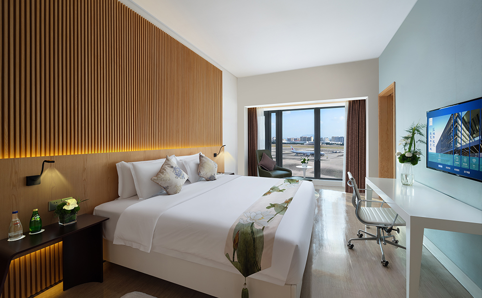The hotel has 334 stylish and cozy guest rooms. Each room is equipped with a large double - glazed landscape floor - to - ceiling window, enabling guests to watch the take - off and landing of planes without leaving the room, enjoying a multi - dimensional visual feast.