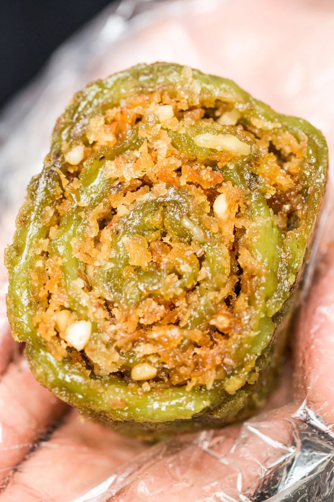 Pandan—Hainan’s “green magician” herb—yields emerald juice when crushed, perfuming desserts with floral notes. Pandan-coconut mille crepe layers the juice with coconut milk, steaming into jade-like translucence.