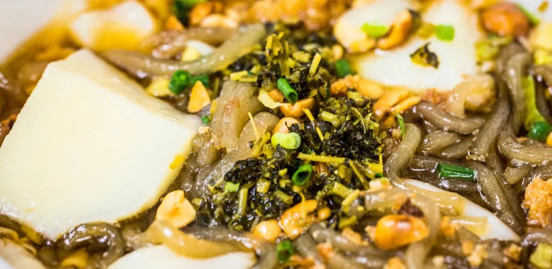 Gangmen Sour Noodles: Unlike hot soups, this chilled dish tosses sweet potato noodles, rice cakes, and handmade noodles in tangy sauce, topped with fried crunch and peanuts—cool, slippery summer relief.