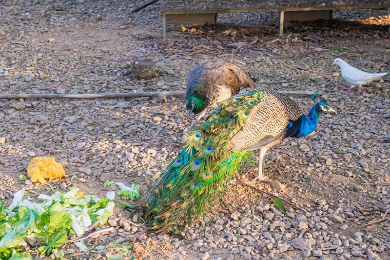 There are also peacocks pacing gracefully aside, occasionally spreading their gorgeous tail feathers, adding a bright color to this beautiful afternoon. The black goats are grazing leisurely not far away, forming a harmonious picture.
