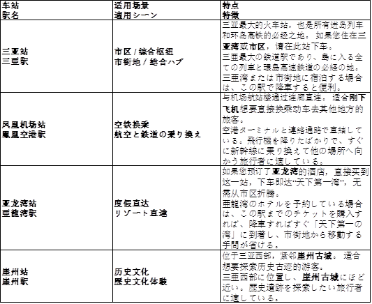 B.海口経由の乗り換え:内陸の他の都市から出発される場合は、通常まず海口駅または海口東駅に到着する。その際、世界初の環島高速鉄道である海南環島高速鉄道に乗り換えることができる。同鉄道は海口・文昌・三亜などの沿海都市を結び、本数が多く、速くて快適である。海口から三亜まではわずか 1.5~2 時間で到着する。南へ向かう旅路では、車窓の外には続く海岸線、ヤシの林、熱帯の景色が広がり、その一瞬一瞬が最高の海岸風景道となる。三亜には計 4 つの主要な鉄道駅があり、目的地に応じて降車駅を選ぶことができる。