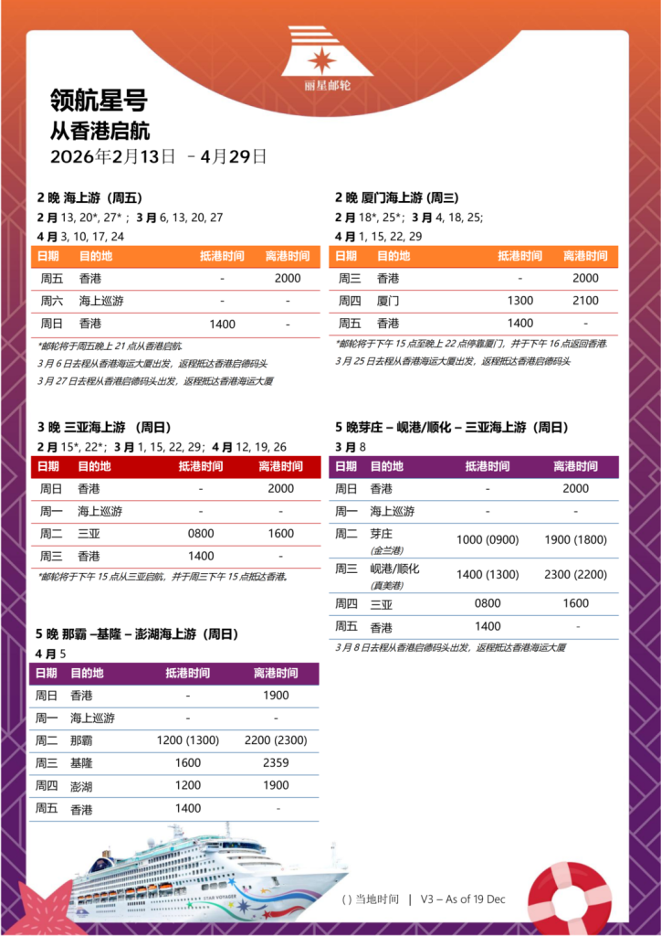 *チケット購入方法:Star Cruises麗星クルーズのWeChat公式アカウントまたは小红书(Xiaohongshu)でご相談ください