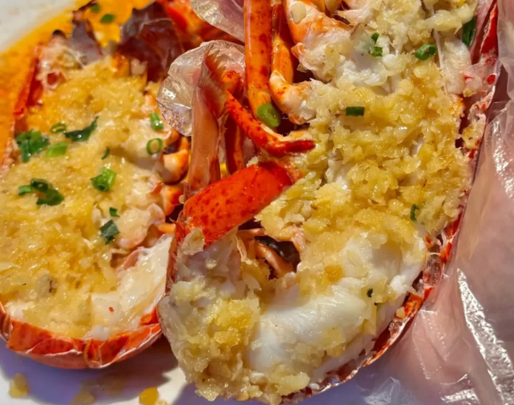 이 조리법은 랍스터 본연의 맛을 최대한 보존한다. 하얗고 탄력 있는 속살은 달콤하고, 마늘 향이 쪄내는 김에 실려 속까지 스며들어 감칠맛을 더하지만 본연의 맛을 가리지 않는다. 이 요리는 해산물 잔치를 받치는 중심 요리다.