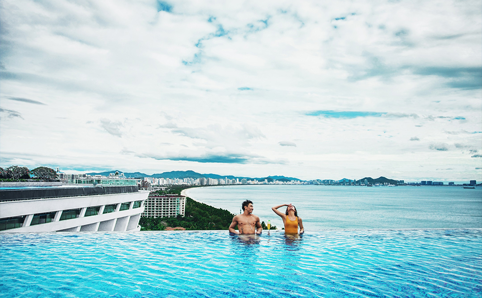 酒店拥有国内最大的1200㎡顶层无边际泳池、顶层日落观赏最佳地带、最浪漫的水上空中求婚平台、独特的70米高空悬挑透明泳池以及三亚湾首家室内恒温泳池。精心设计的莲泰水疗、健身中心以及三亚湾首家500㎡酷得爽儿童中心。设施齐全的1200㎡大型多功能厅及9个会议厅能够满足不同的会议需求。