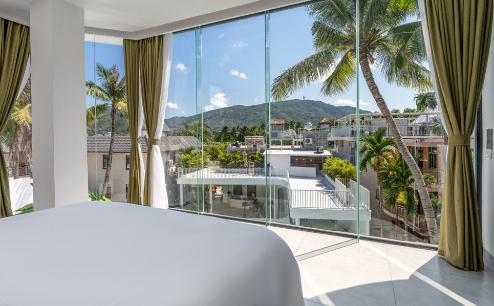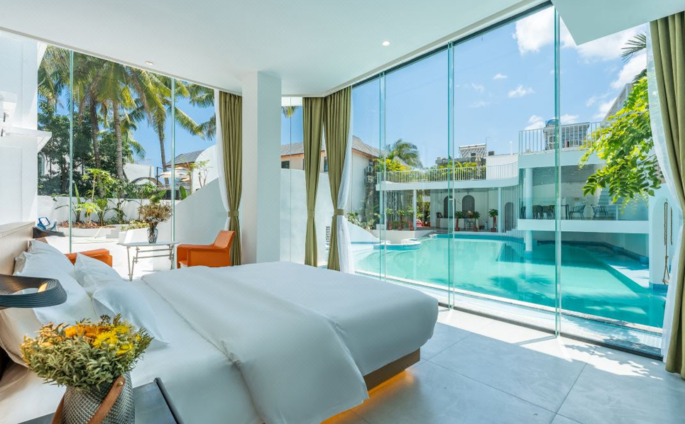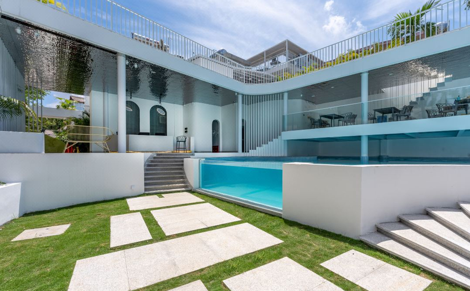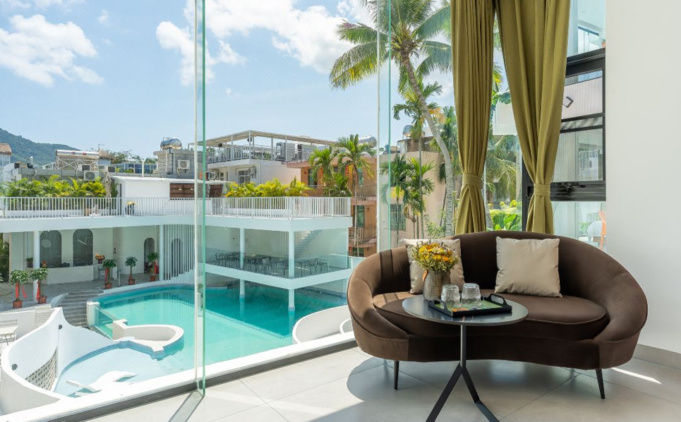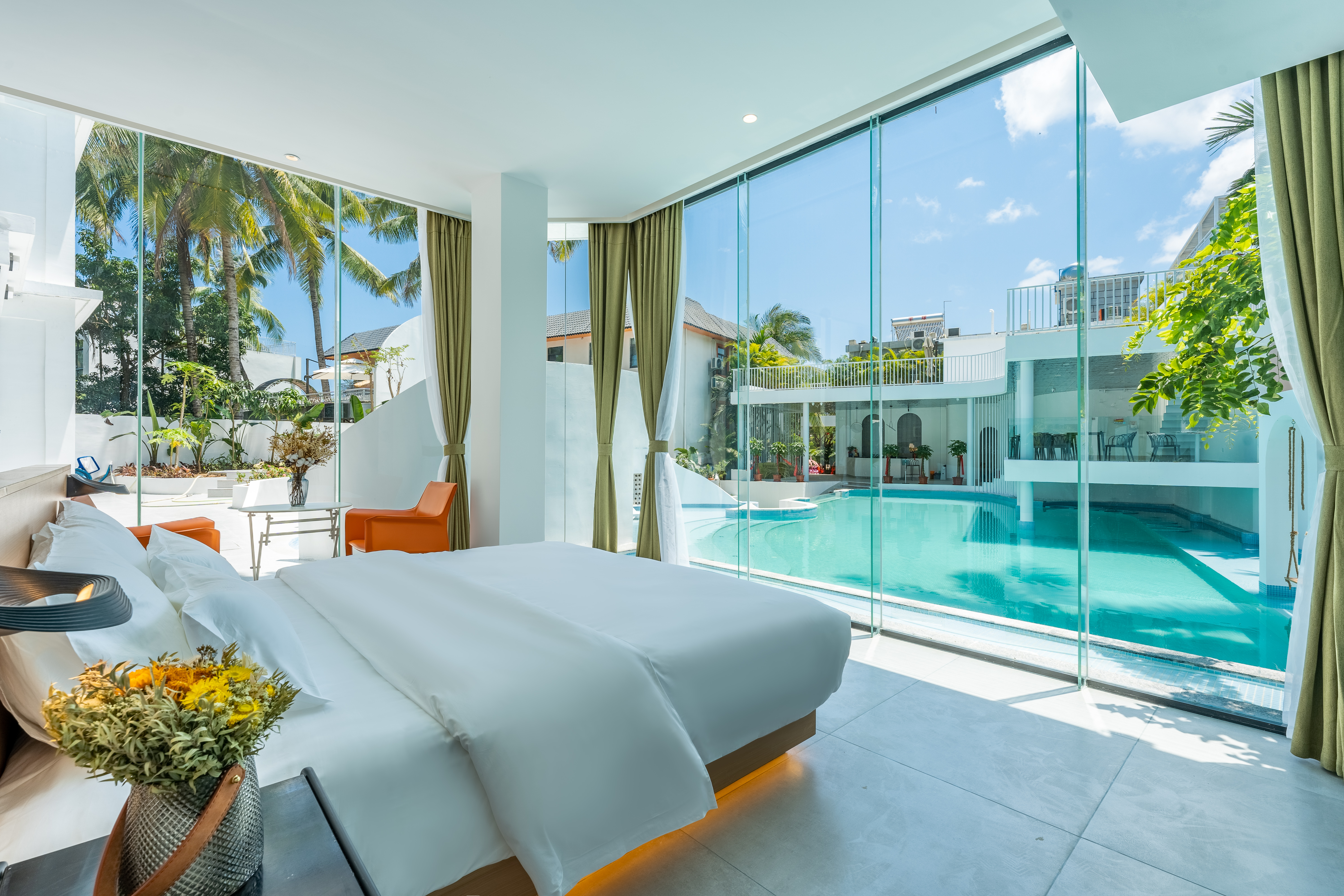 民宿主体由两栋白楼组成,连接白楼的是象征着通往希望的暖橘色螺旋楼梯,爱马仕配色的旋转楼梯,线条凌冽的区域划分,院子前天蓝的ins风大泳池与院子中白色涂装相映生辉,入眼仿佛置身天堂,后院椰林小道宛如隐居于世,为这惬意的环境点缀了民宿独有的神秘,随手一拍皆是美景。