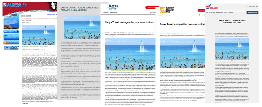 ↑ Скриншоты статей, опубликованных Malaysia News Agency, News2u Singapore, Travel Journal Macao, Cambodia Industry Wire, North Korea Travel News.