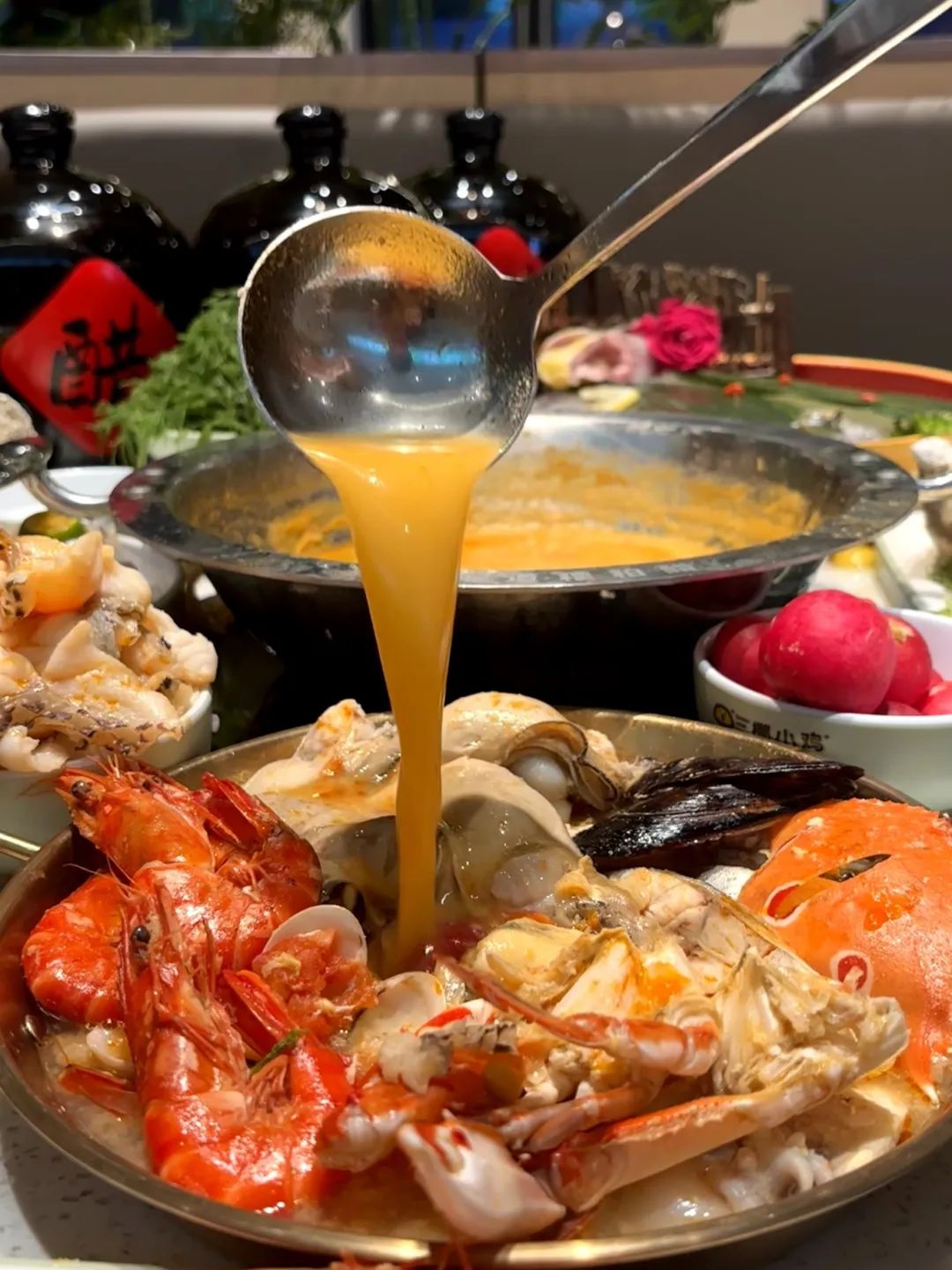 Главный акцент Цзаопоцу — морепродукты: креветки, устрицы, кальмары, мидии... Они впитывают аромат бульона, не требуя соусов — их свежесть говорит сама за себя.