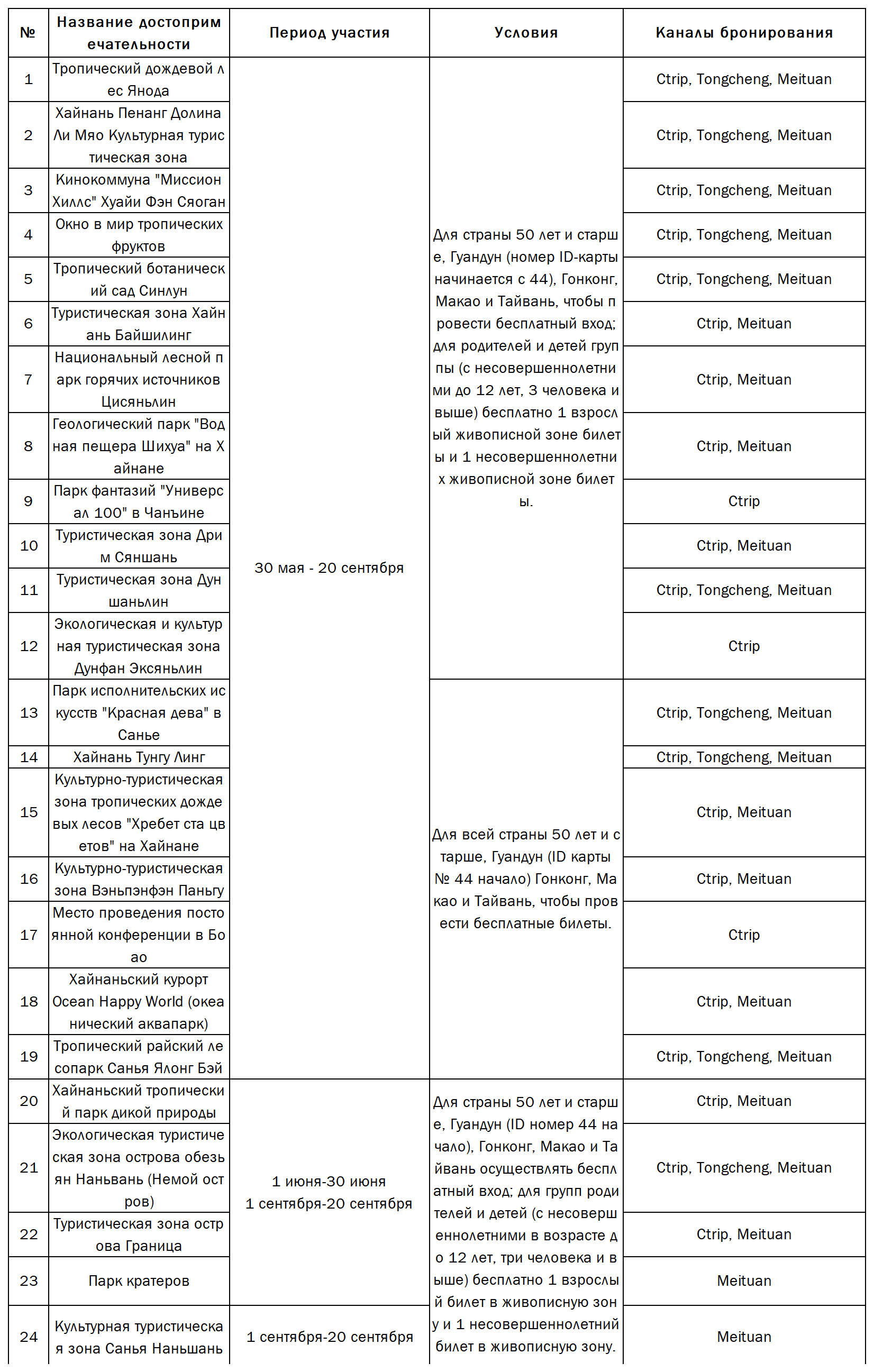 Акция «Летний отдых на прохладном острове со скидками» 2025 года предлагает бесплатный вход в участвующие достопримечательности следующим категориям: граждане по всей стране в возрасте 50 лет и старше; жители провинции Гуандун (идентификационные номера начинаются с 44), Гонконга, Макао и Тайваня. Для семейных групп с детьми (включая несовершеннолетних младше 12 лет, группа из 3-х и более человек) предоставляется бесплатный 1 взрослый билет и 1 билет для несовершеннолетнего младше 12 лет.